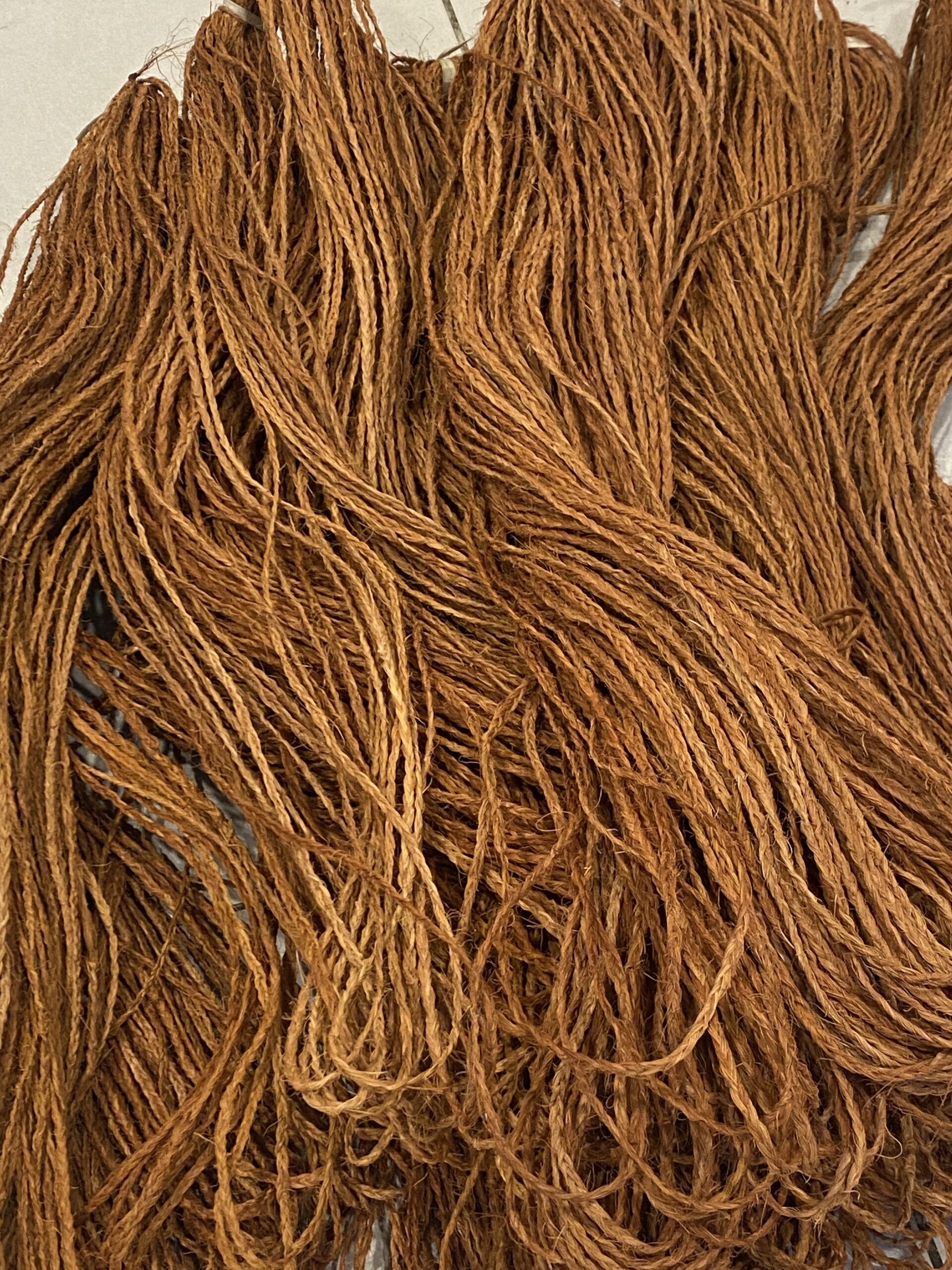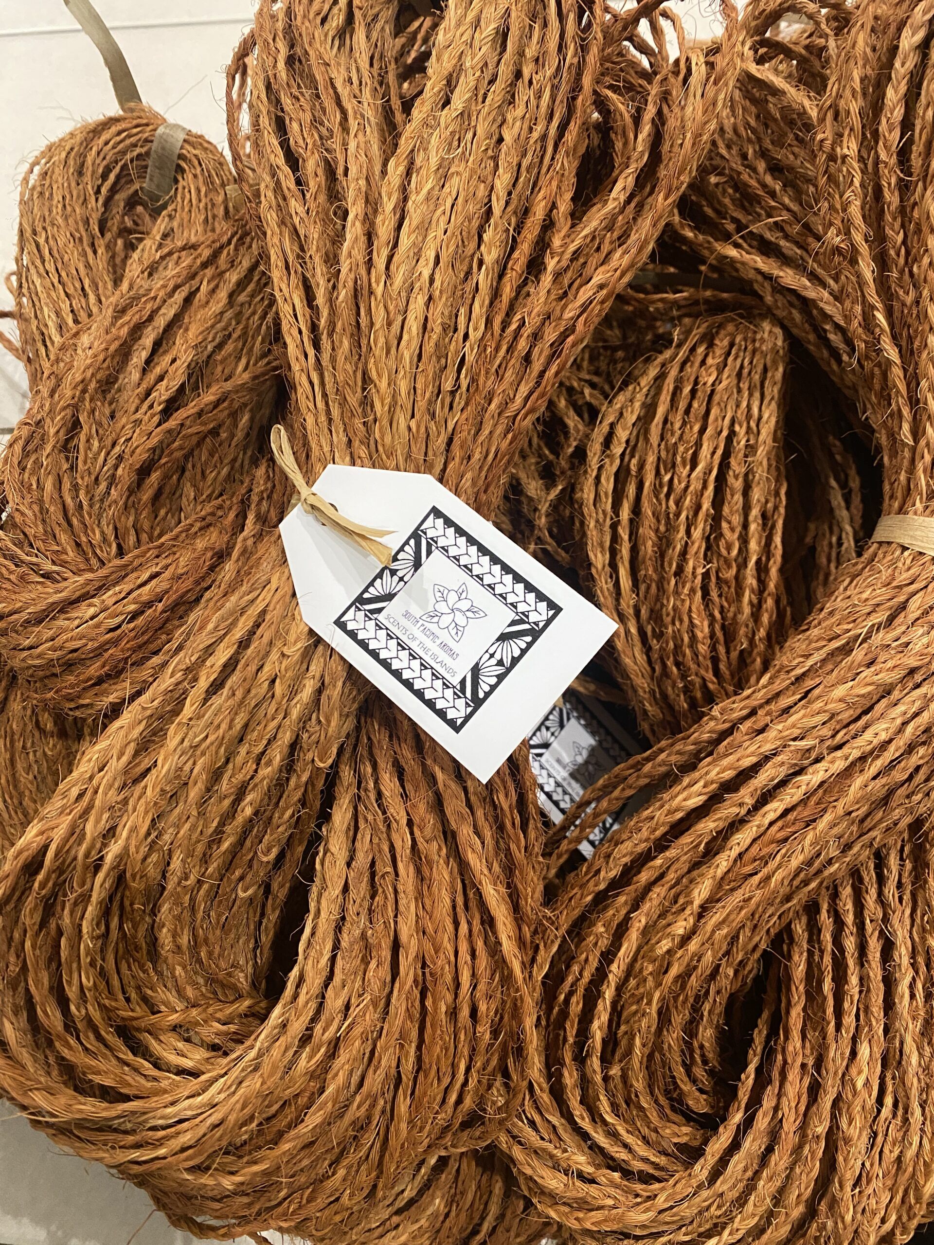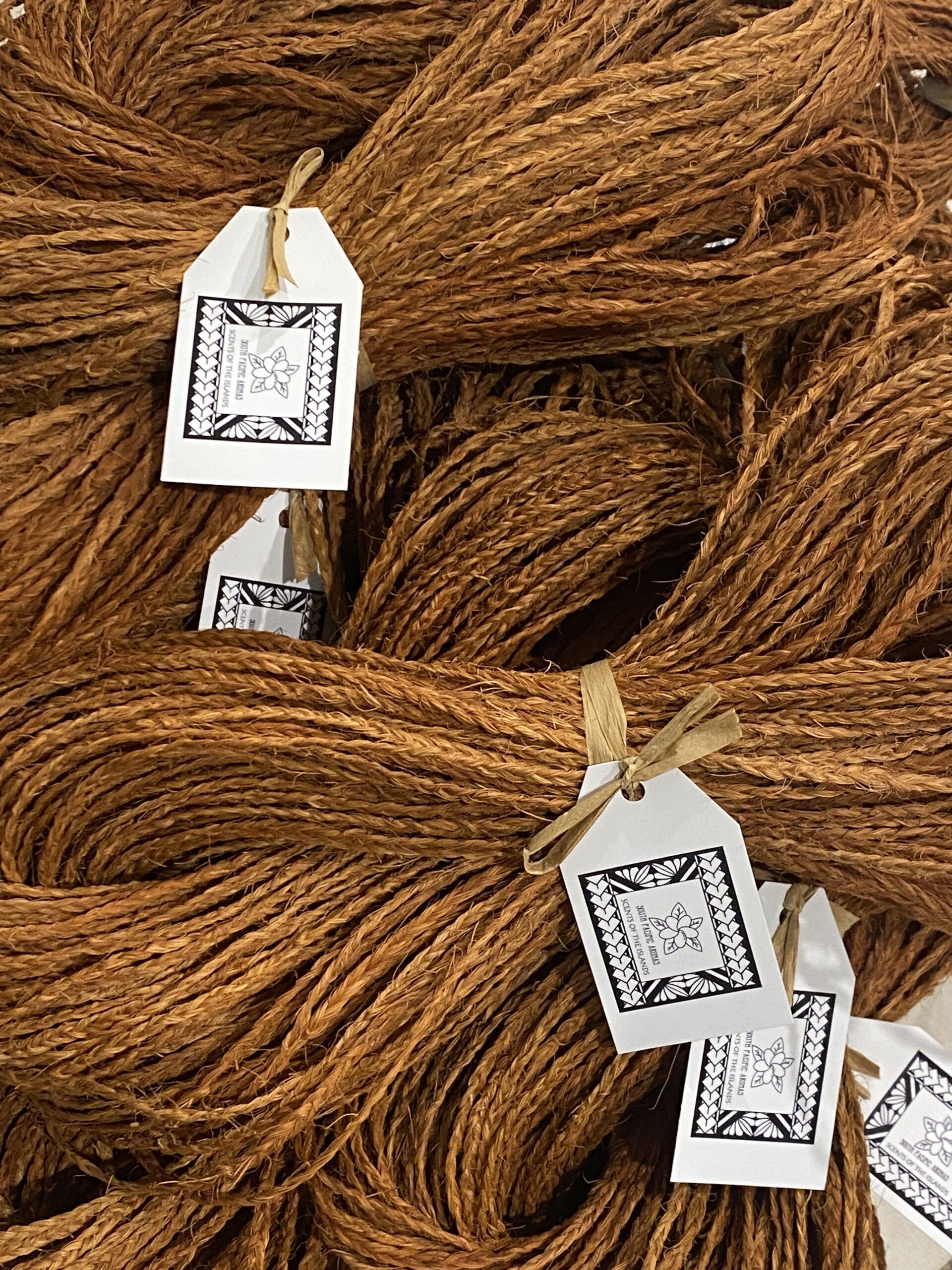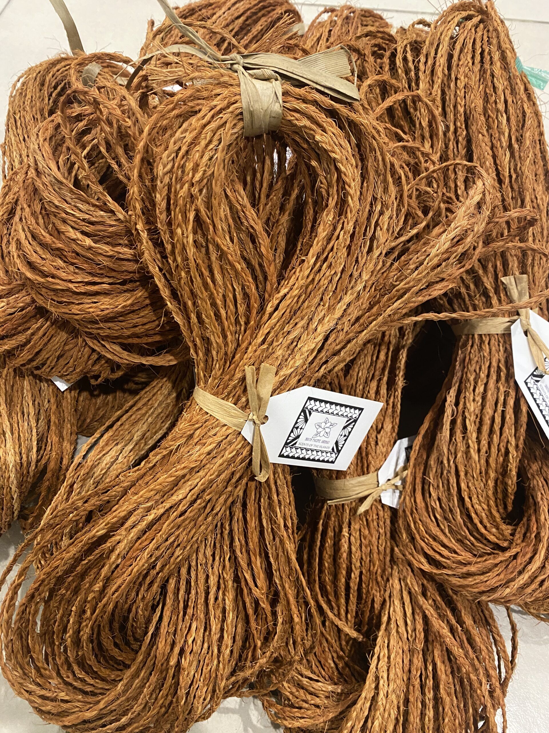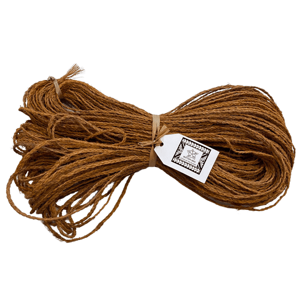 The Kafa pulu (in the Tongan language) is also known as ‘Mangi mangi’ (in the Fijian language) is hand made from natural coconut husks. The brown fibrous texture is rubbed together to form long strands. These strands are then braided, and knotted in the ends to avoid the braids coming undone.