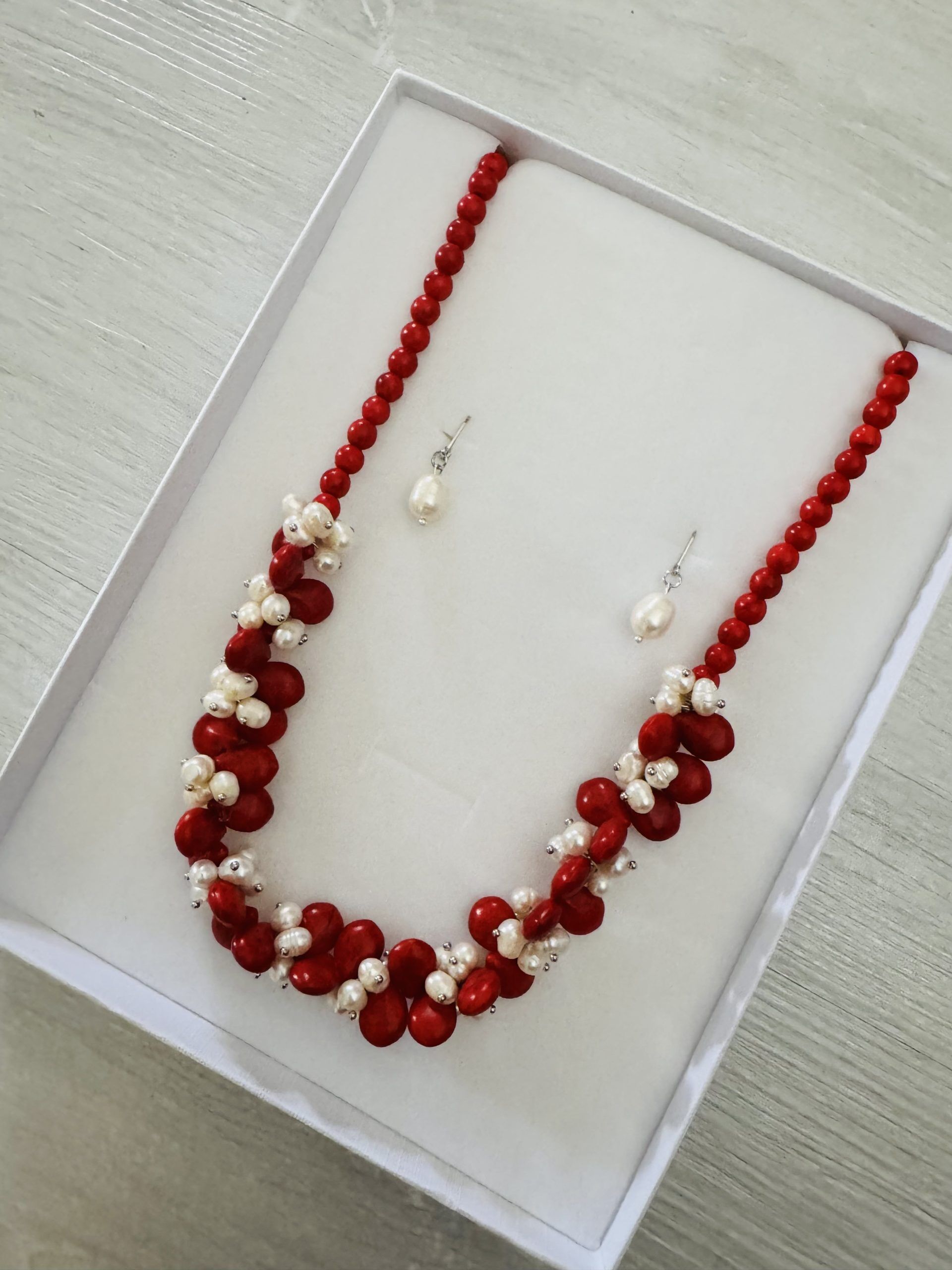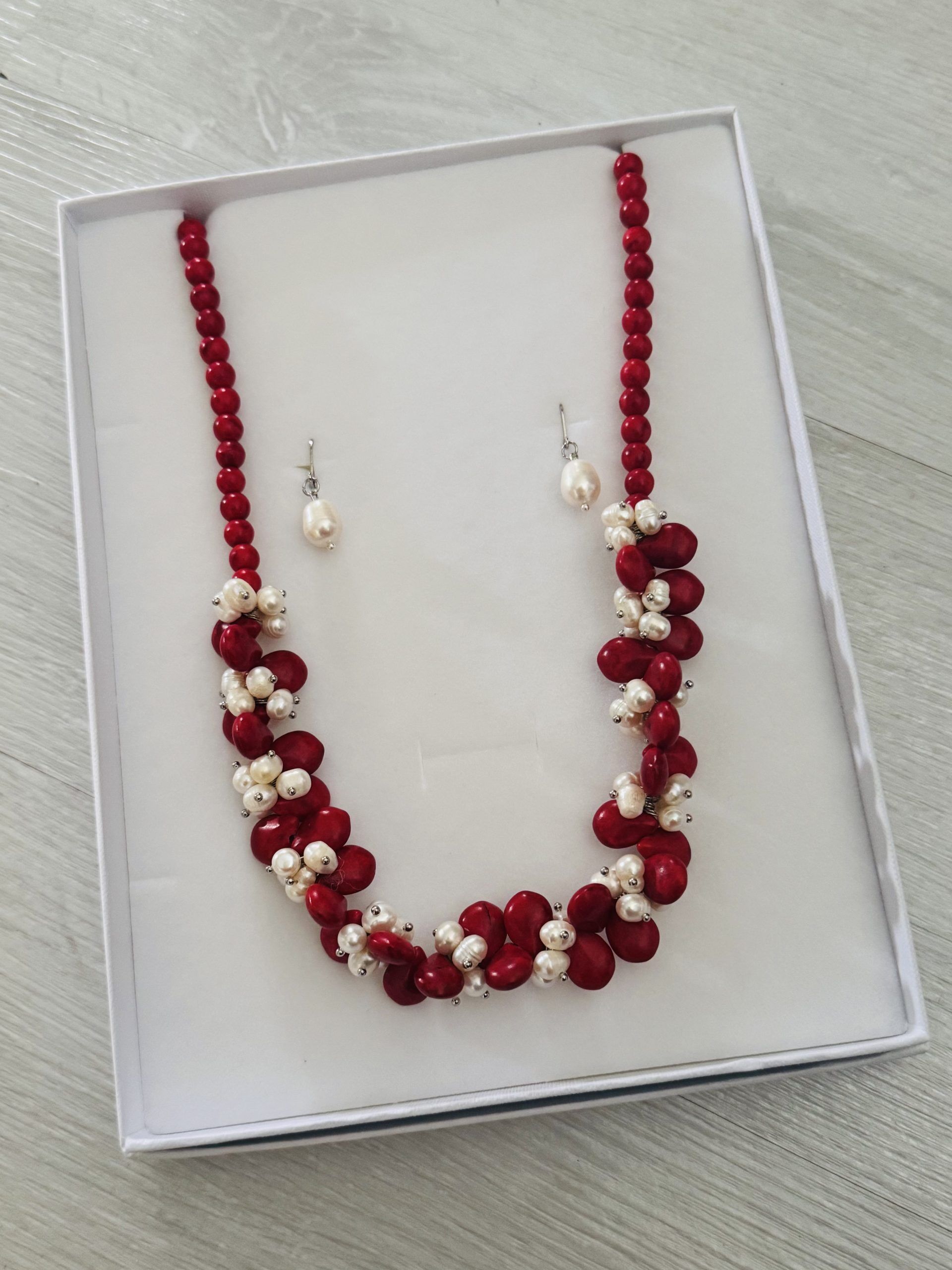 2pc White Fresh Water Pearl Necklace with Red Coral & White Pearl Earrings